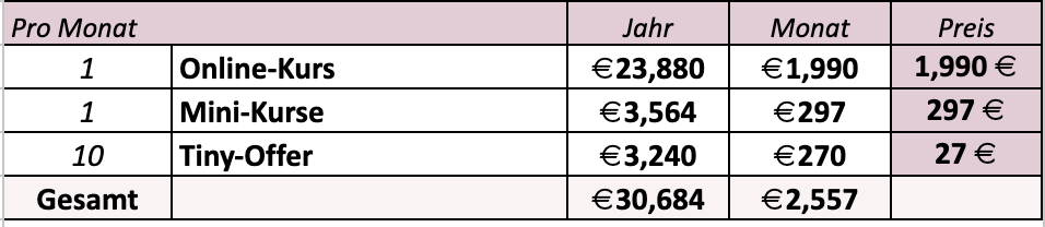 - Verkaufst du jeden Monat 1 Mini-Kurs für 297€, sind das 3.564€ pro Jahr.