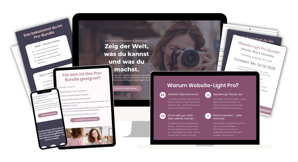 Mit klaren Schritt-für-Schritt-Plänen, Vorlagen und Checklisten – damit du dein Ziel erreichst, ohne dich zu verzetteln oder frustriert aufzugeben. Und mit einer persönlichen und einfühlsamen Begleitung, die dir jederzeit Sicherheit und Zuversicht gibt.