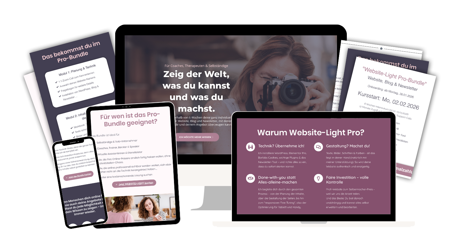 „Website Light“ ist ein Done-With-You-Projekt – das bedeutet, wir arbeiten zusammen: Ich übernehme alle technischen Grundlagen, und du gestaltest die Seiten und Inhalte.